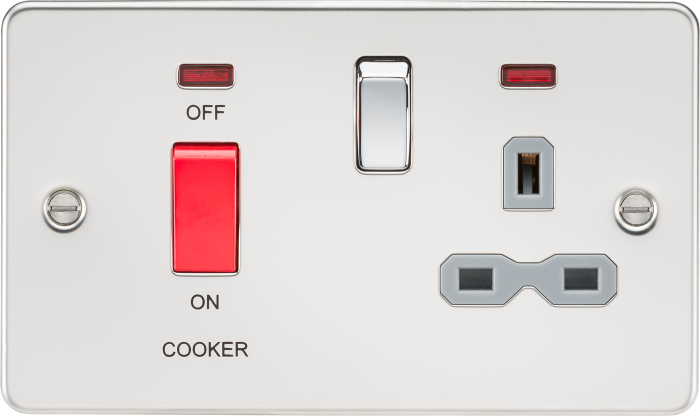 Knightsbridge FPR8333NPCG Flat Plate 45A DP Switch & 13A Switched Socket With Neon - Polished Chrome With Grey Insert
