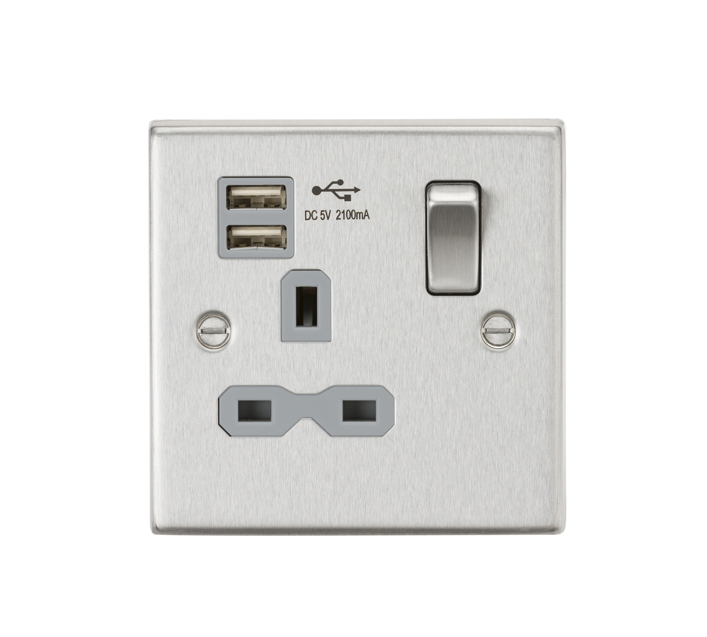 Knightsbridge CS91BCG 13A 1G Switched Socket Dual USB Charger (2.1A) with Grey Insert - Square Edge Brushed Chrome