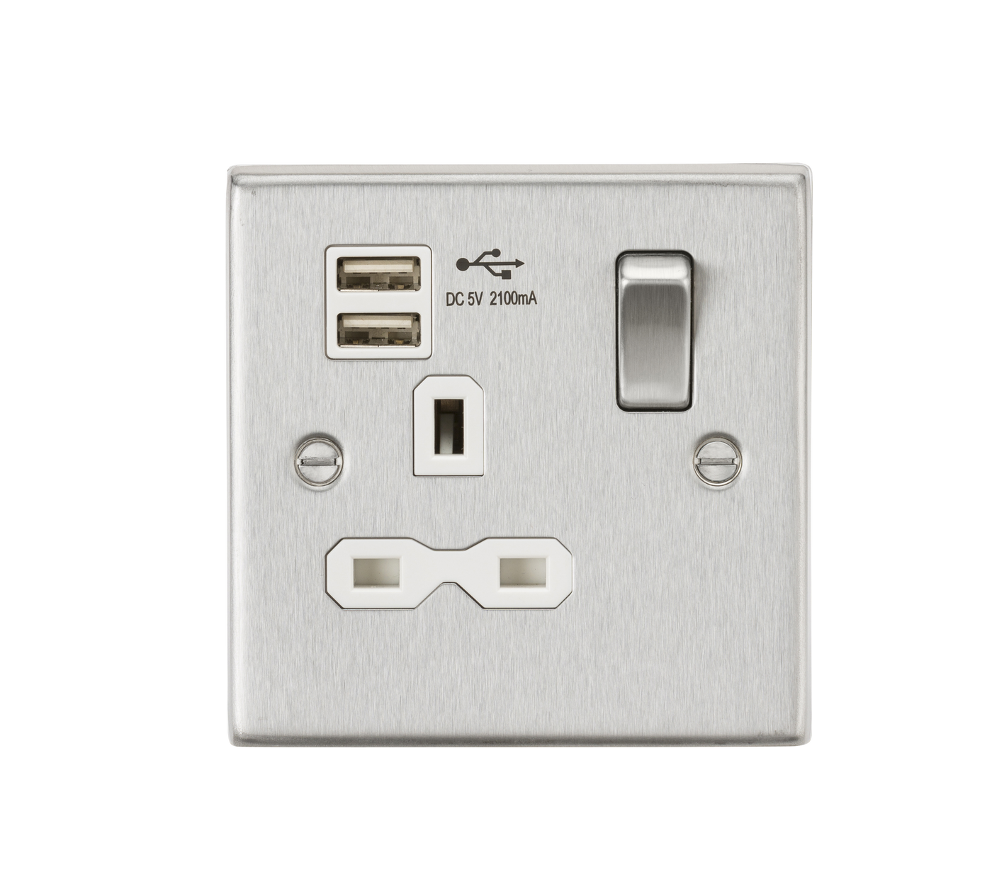Knightsbridge CS91BCW 13A 1G Switched Socket Dual USB Charger (2.1A) with White Insert - Square Edge Brushed Chrome