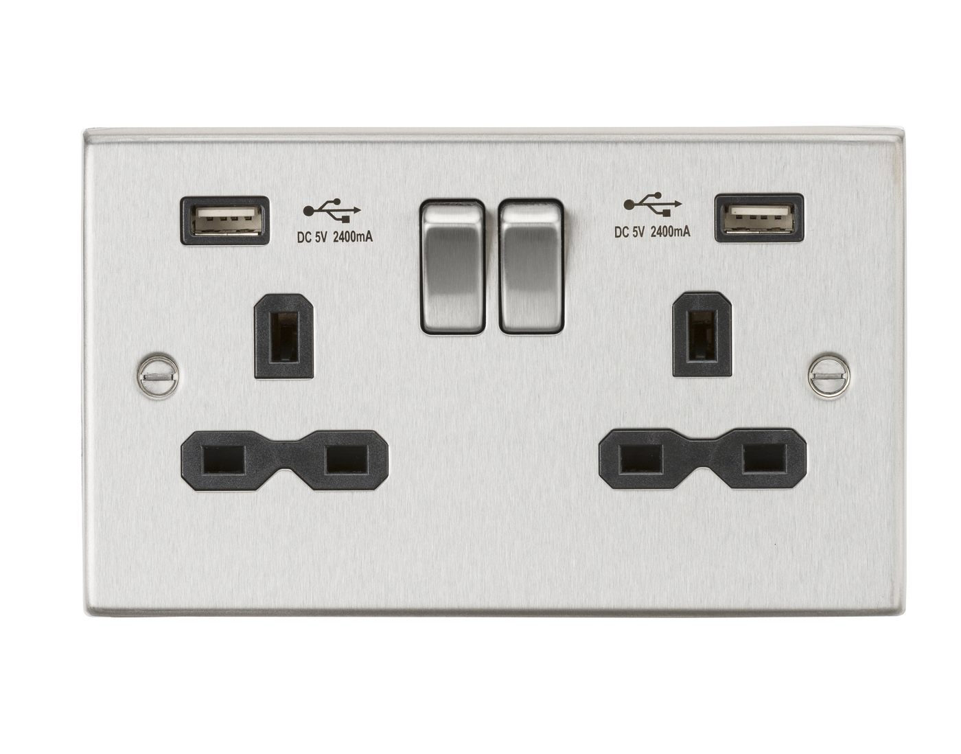 Knightsbridge CS9224BC 13A 2G Switched Socket Dual USB Charger (2.4A) with Black Insert - Square Edge Brushed Chrome