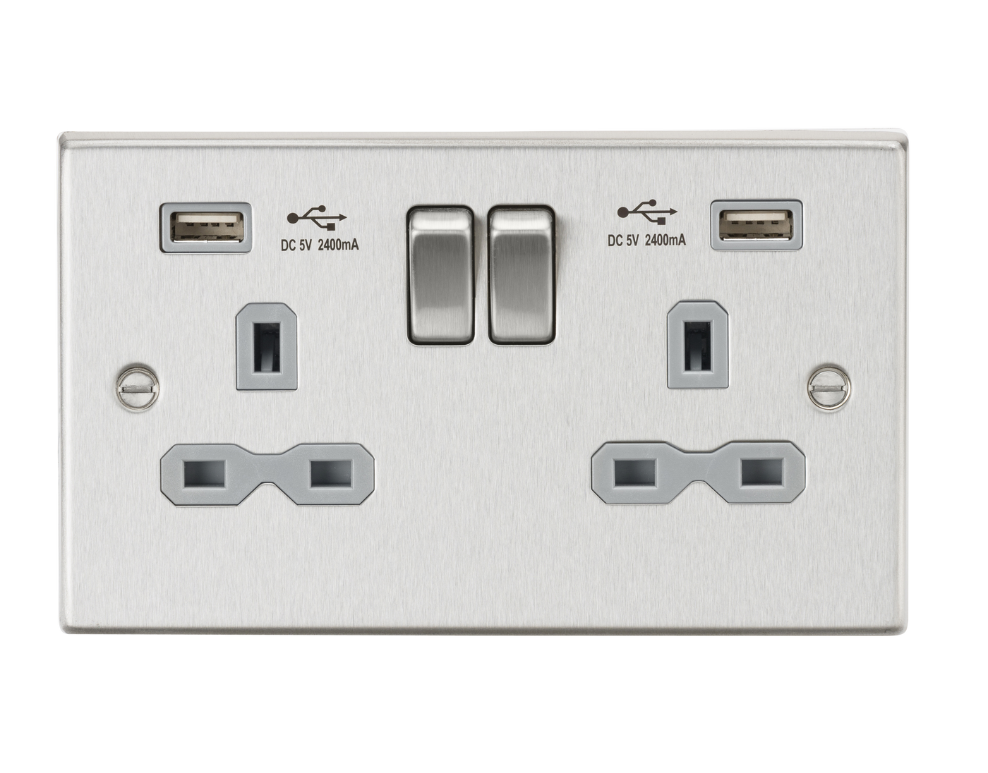 Knightsbridge CS9224BCG 13A 2G Switched Socket Dual USB Charger (2.4A) with Grey Insert - Square Edge Brushed Chrome