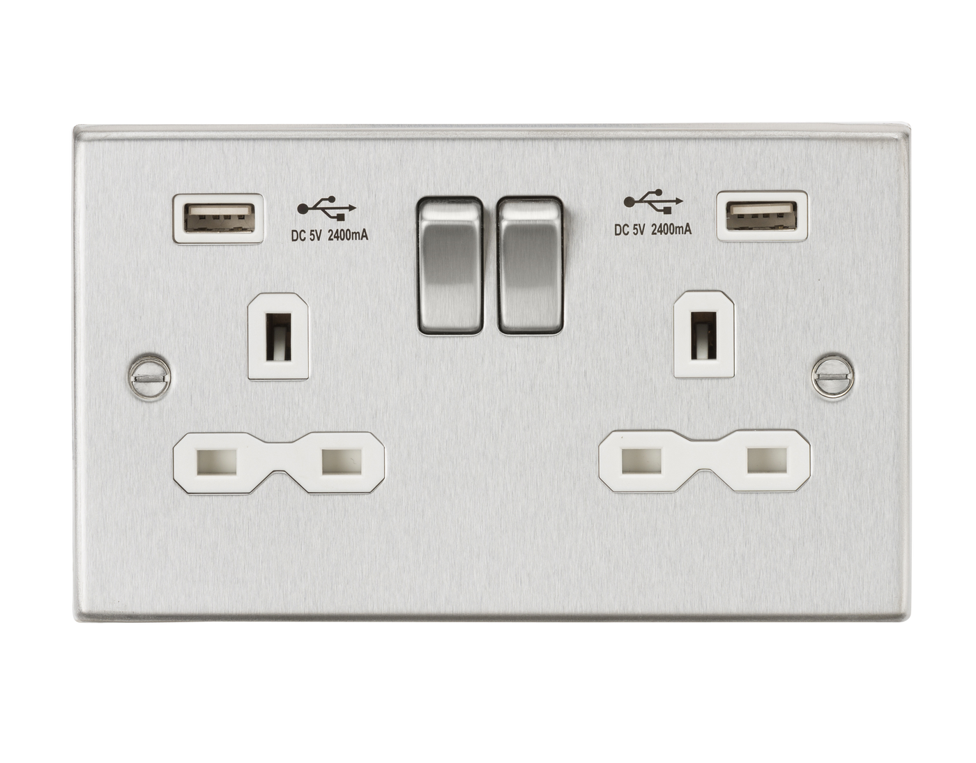 Knightsbridge CS9224BCW 13A 2G Switched Socket Dual USB Charger (2.4A) with White Insert - Square Edge Brushed Chrome