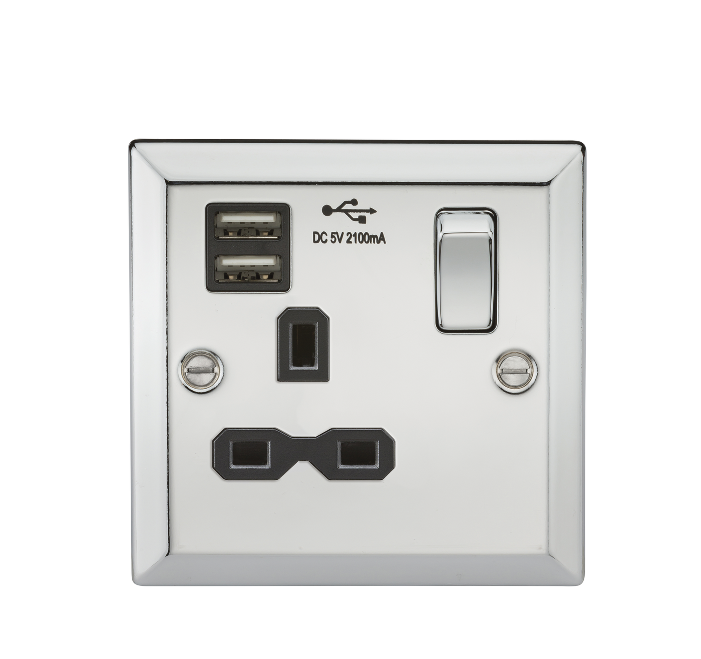 Knightsbridge CV91PC 13A 1G Switched Socket Dual USB Charger Slots with Black Insert - Bevelled Edge Polished Chrome