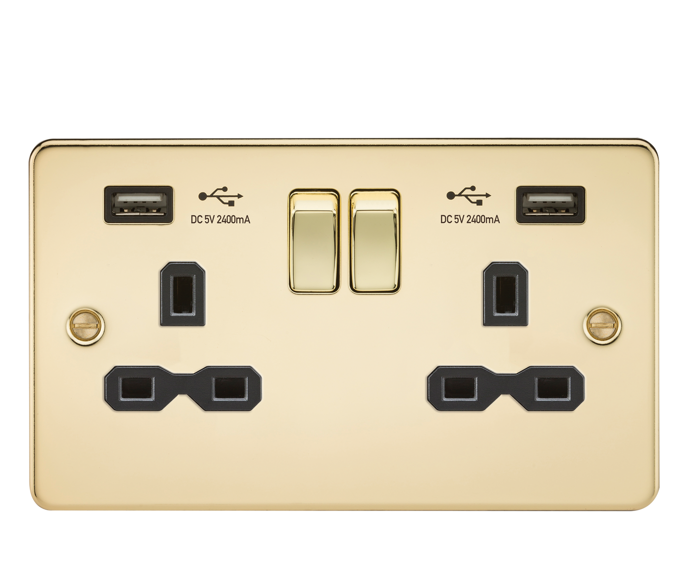 Knightsbridge FPR9224PB Flat plate 13A 2G switched socket with dual USB charger (2.4A) - polished brass with black insert
