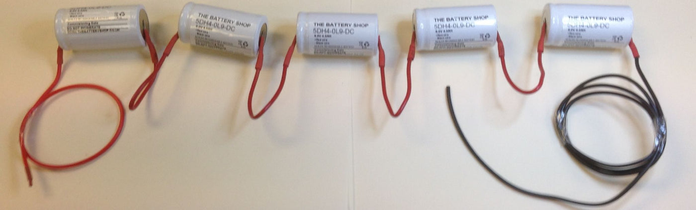 Dimensions : 32.3 mm Diameter x (5x)60mm Long; 5DH4-0L9-DC 6.0v 4.0Ah Ni-Cd battery for use in emergency lighting.; Terminals : Red and black flying leads; Battery Type: High temperature nickel-cadmium battery (Ni-Cd) for use in emergency lighting.