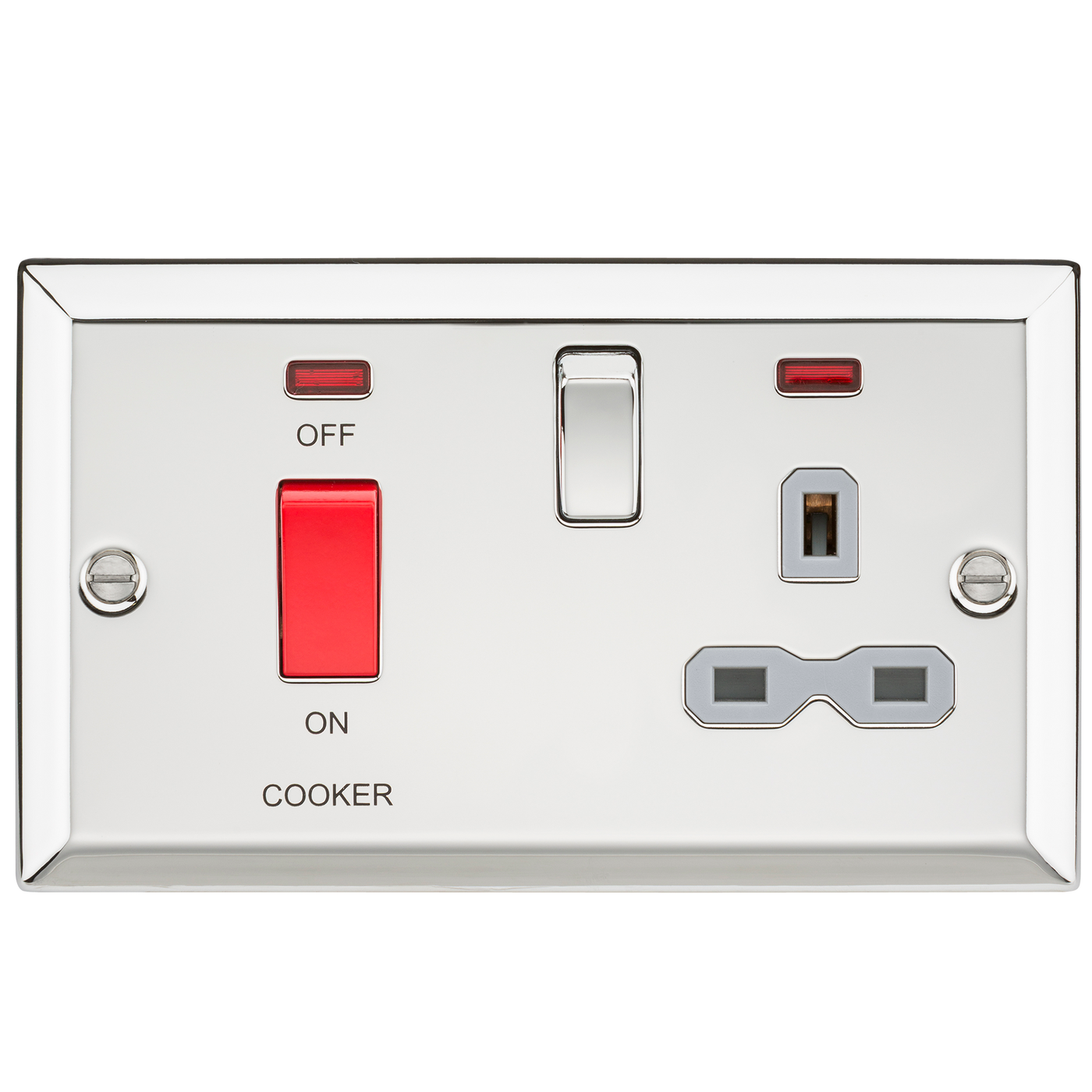 Knightsbridge CV83PCG 45A DP Cooker Switch & 13A Switched Socket with Neons & Grey Insert - Bevelled Edge Polished Chrome