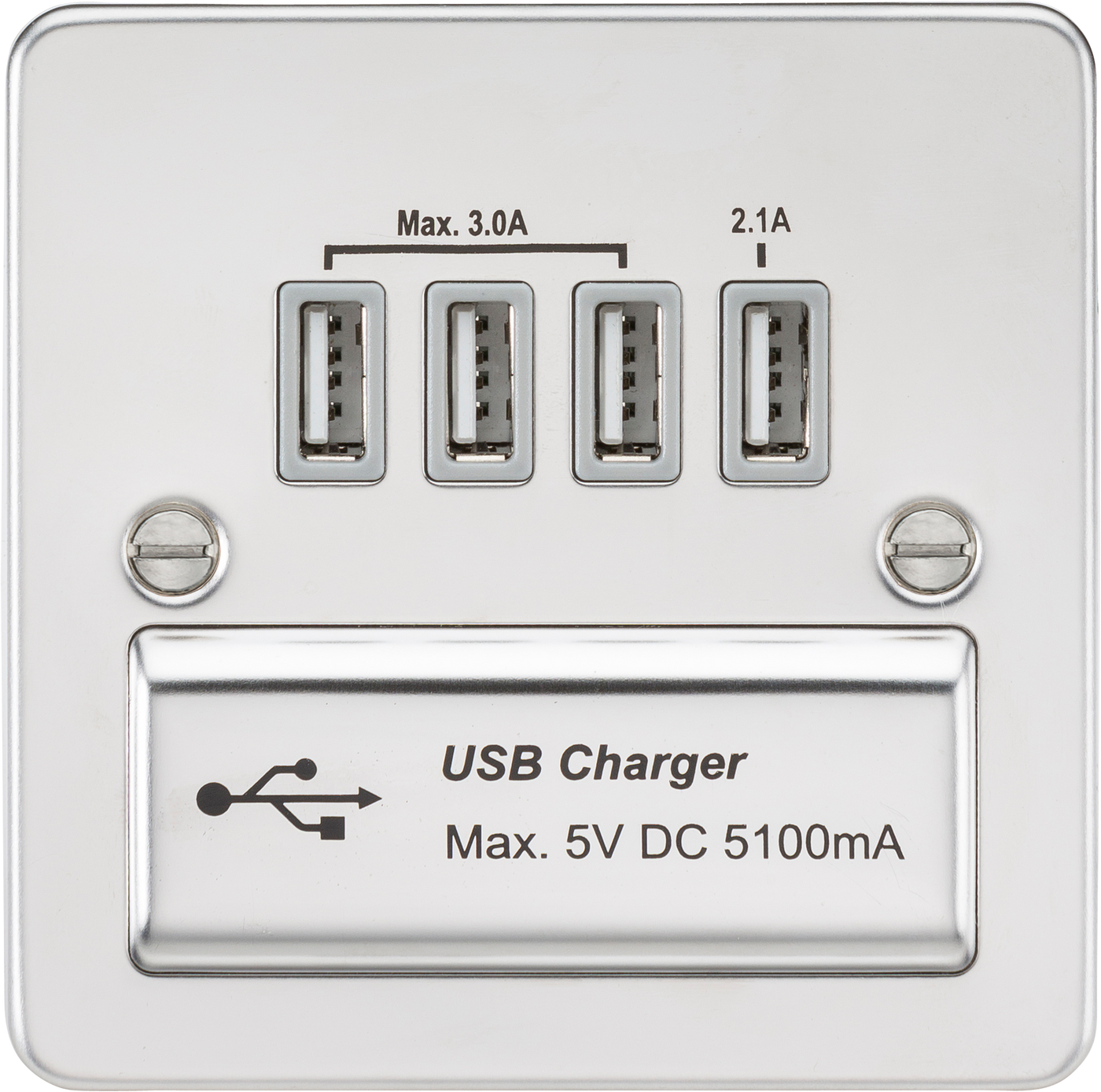 Knightsbridge FPQUADPCG Flat Plate 1G QUAD USB Charger Outlet 5V DC 5.1A - Polished Chrome With Grey Insert