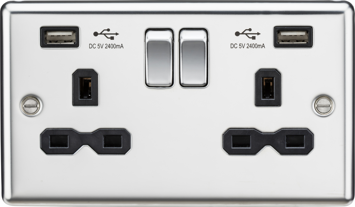 Knightsbridge CL9224PC 13A 2G DP Switched Socket With Black Inserts- USB Rounded Edge Polished Chrome