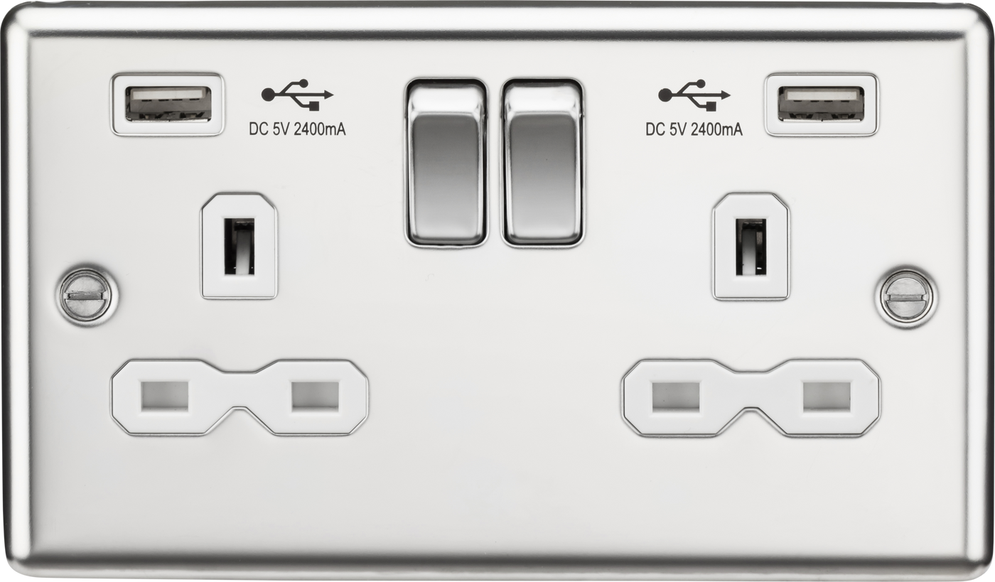Knightsbridge CL9224PCW 13A 2G DP Switched Socket With White Inserts - USB Rounded Edge Polished Chrome