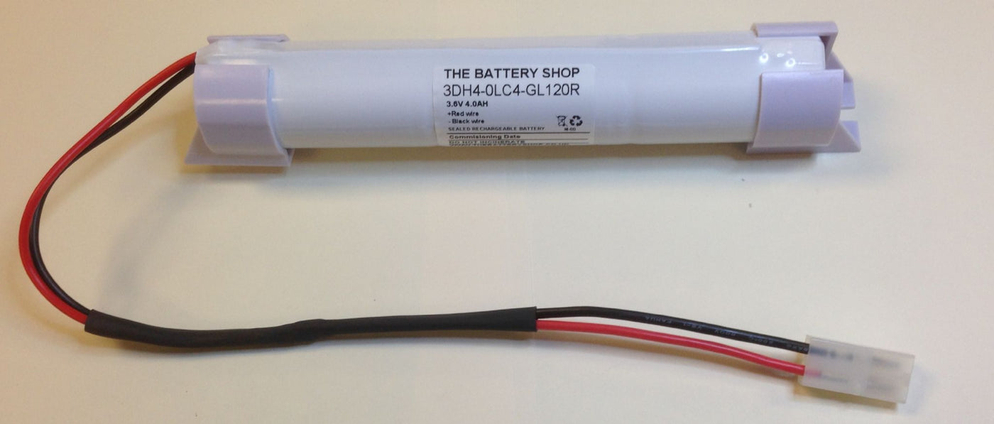 3.6v 4.0Ah Ni-Cd battery for use in emergency lighting.; Terminals : Red and black flying leads and connector; Battery Type: High temperature nickel-cadmium battery (Ni-Cd) for use in emergency lighting.