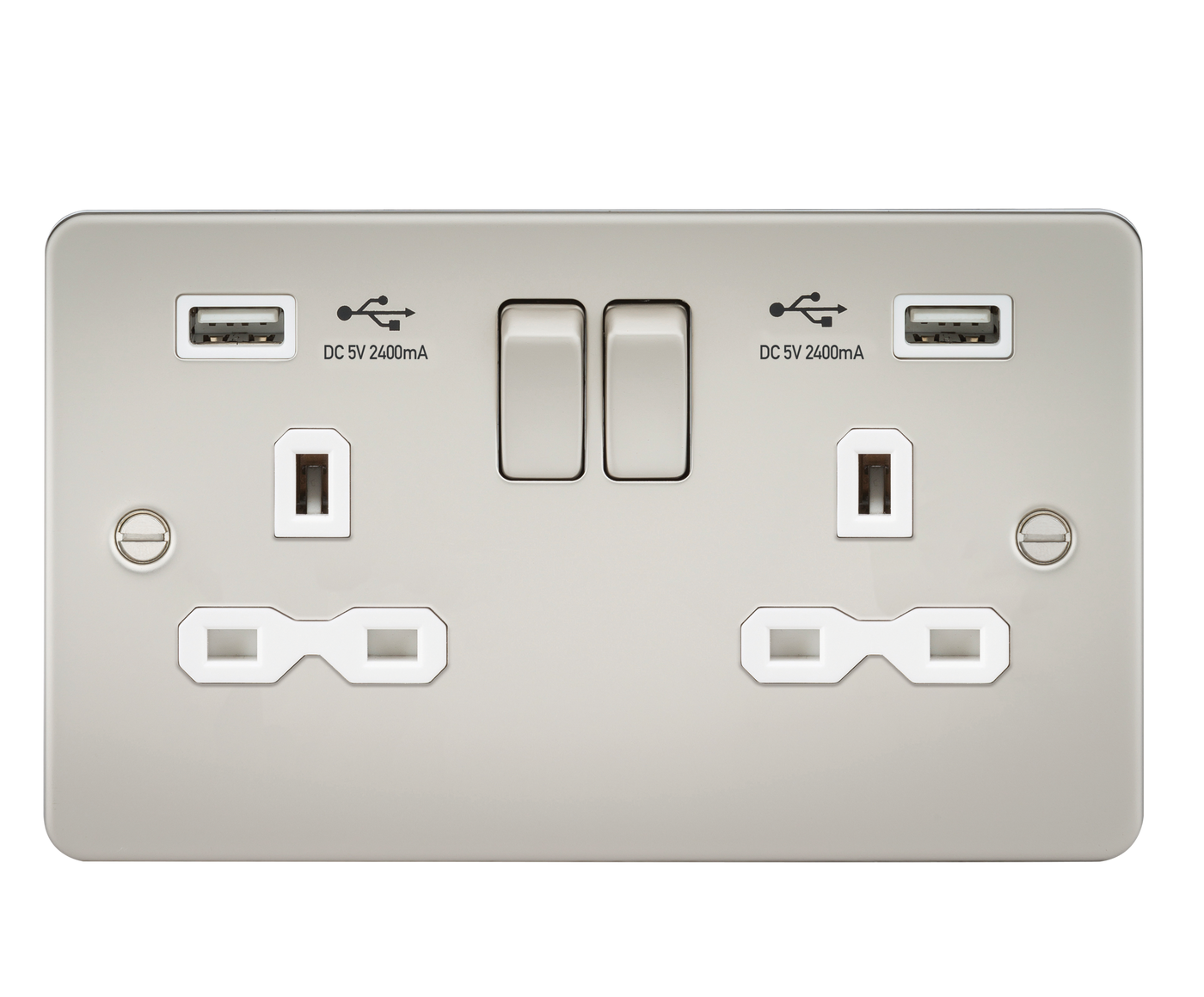 Knightsbridge FPR9224PLW Flat plate 13A 2G switched socket with dual USB charger (2.4A) - pearl with white insert