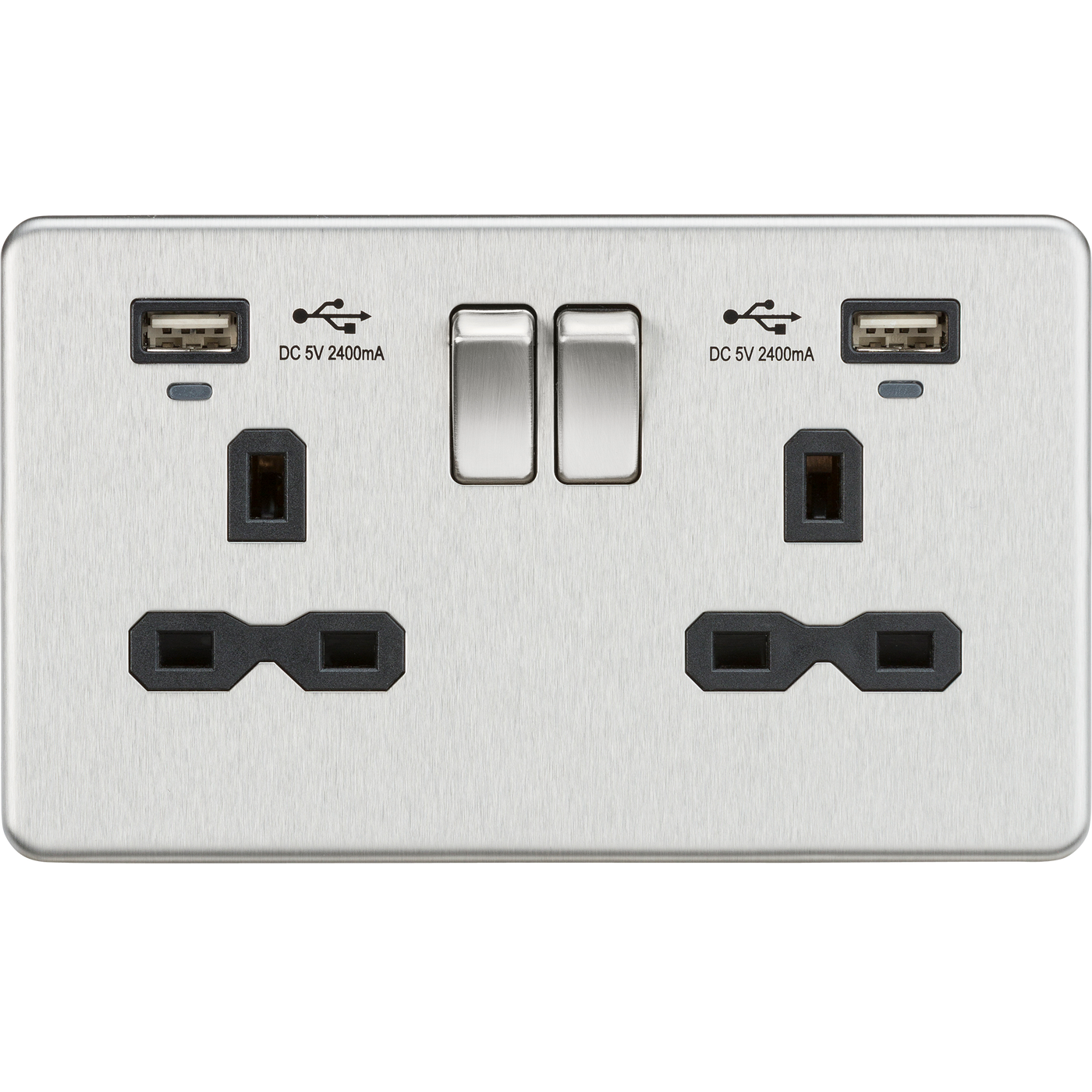 Knightsbridge SFR9904NBC 13A 2G Switched Socket, Dual USB (2.4A) with LED Charge Indicators - Brushed Chrome w/black insert