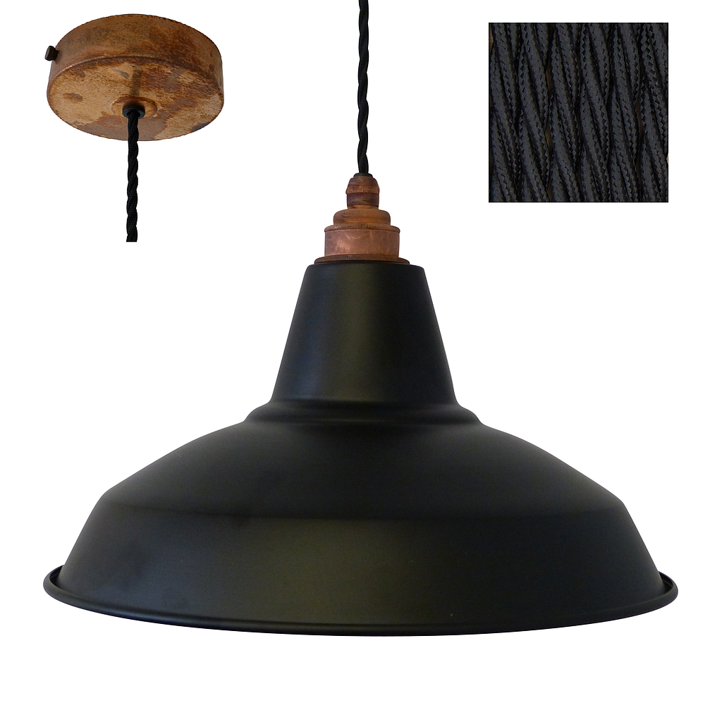 PETE Industrial Shade Pendant Set 1mtr. Black Shade, Rustic Rose, Twisted Black Flex
