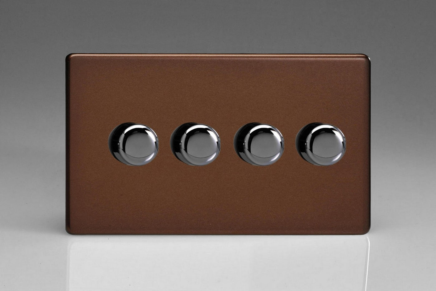 4-Gang 2-Way Push-On/Off Rotary Dimmer 4 x 40-250W (Twin Plate), V-Dim dimming technology, Ideal for incandescent lighting including mains and low voltage halogen , Ideal for incandescent lighting including mains and low voltage halogen .