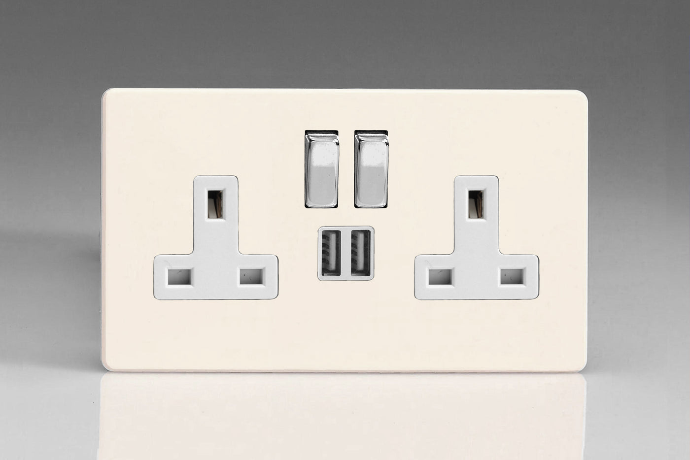 Varilight XDY5U2SWS.PD - 2-Gang 13A Single Pole Switched Socket with Metal Rockers + 2 5V DC 2100mA USB Charging Ports