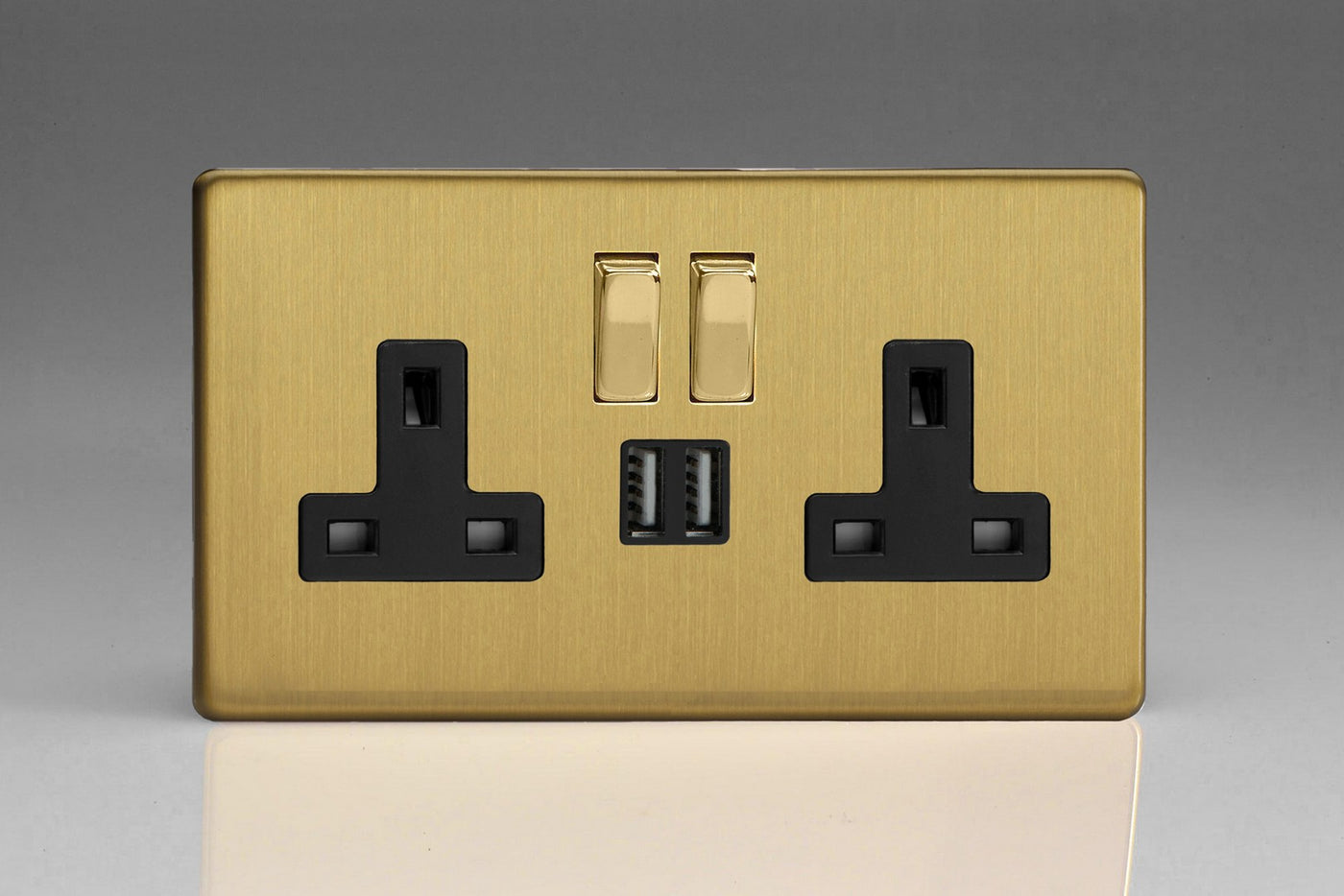 Varilight XDB5U2SBS - 2-Gang 13A Single Pole Switched Socket with Metal Rockers + 2x5V DC 2100mA USB Charging Ports