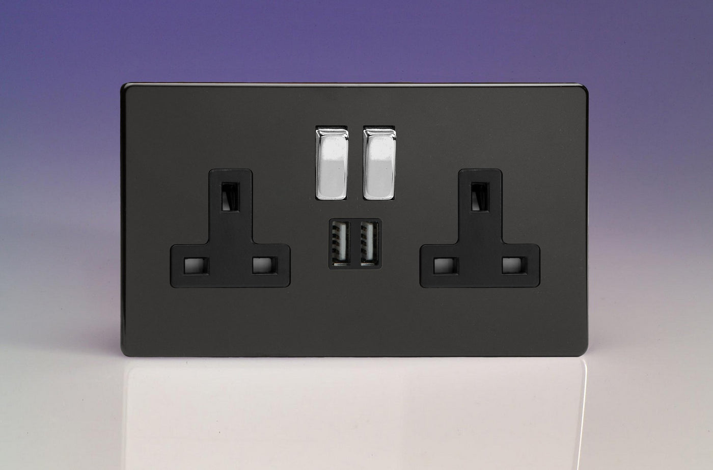 Varilight XDL5U2SBS - 2-Gang 13A Single Pole Switched Socket with Metal Rockers + 2x5V DC 2100mA USB Charging Ports