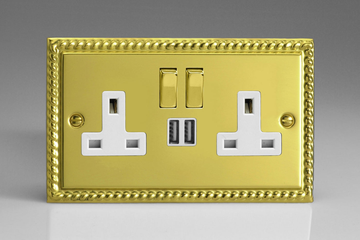 2-Gang 13A Single Pole Switched Socket with Metal Rockers + 2x5V DC 2100mA USB Charging Ports , Ideal for charging iPad, iPhone, tablets, mobiles and cameras, Features VARILIGHT Smart Port technology making it suitable for all types of devices., Features VARILIGHT Smart Port technology making it suitable for all types of devices..