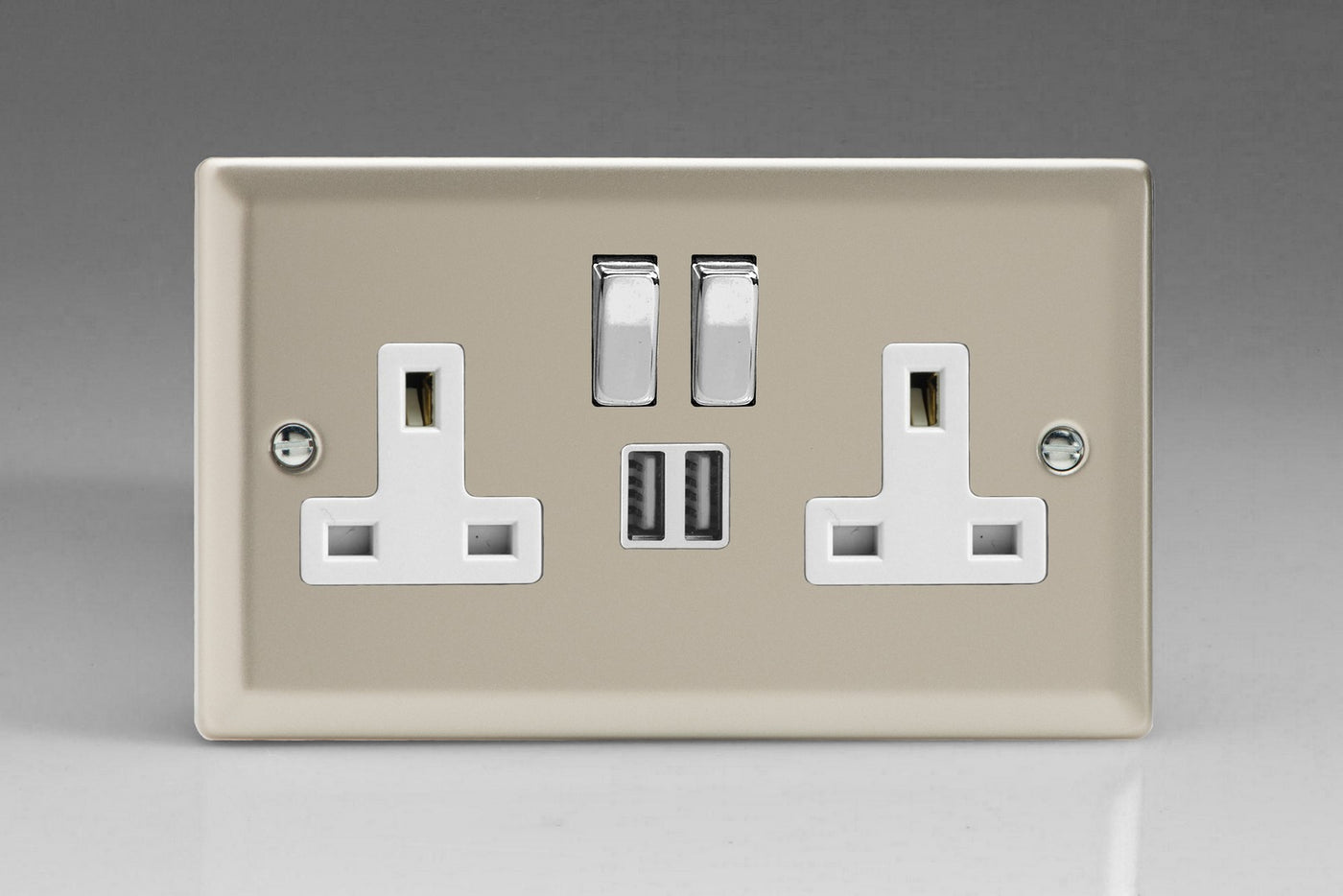 2-Gang 13A Single Pole Switched Socket with Metal Rockers + 2x5V DC 2100mA USB Charging Ports , Ideal for charging iPad, iPhone, tablets, mobiles and cameras, Features VARILIGHT Smart Port technology making it suitable for all types of devices., Features VARILIGHT Smart Port technology making it suitable for all types of devices..