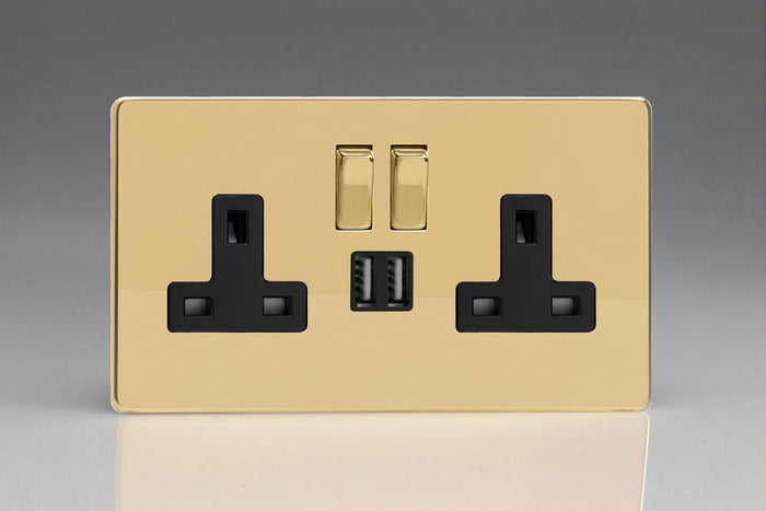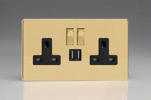 Varilight XDV5U2SBS - 2-Gang 13A Single Pole Switched Socket with Metal Rockers + 2x5V DC 2100mA USB Charging Ports