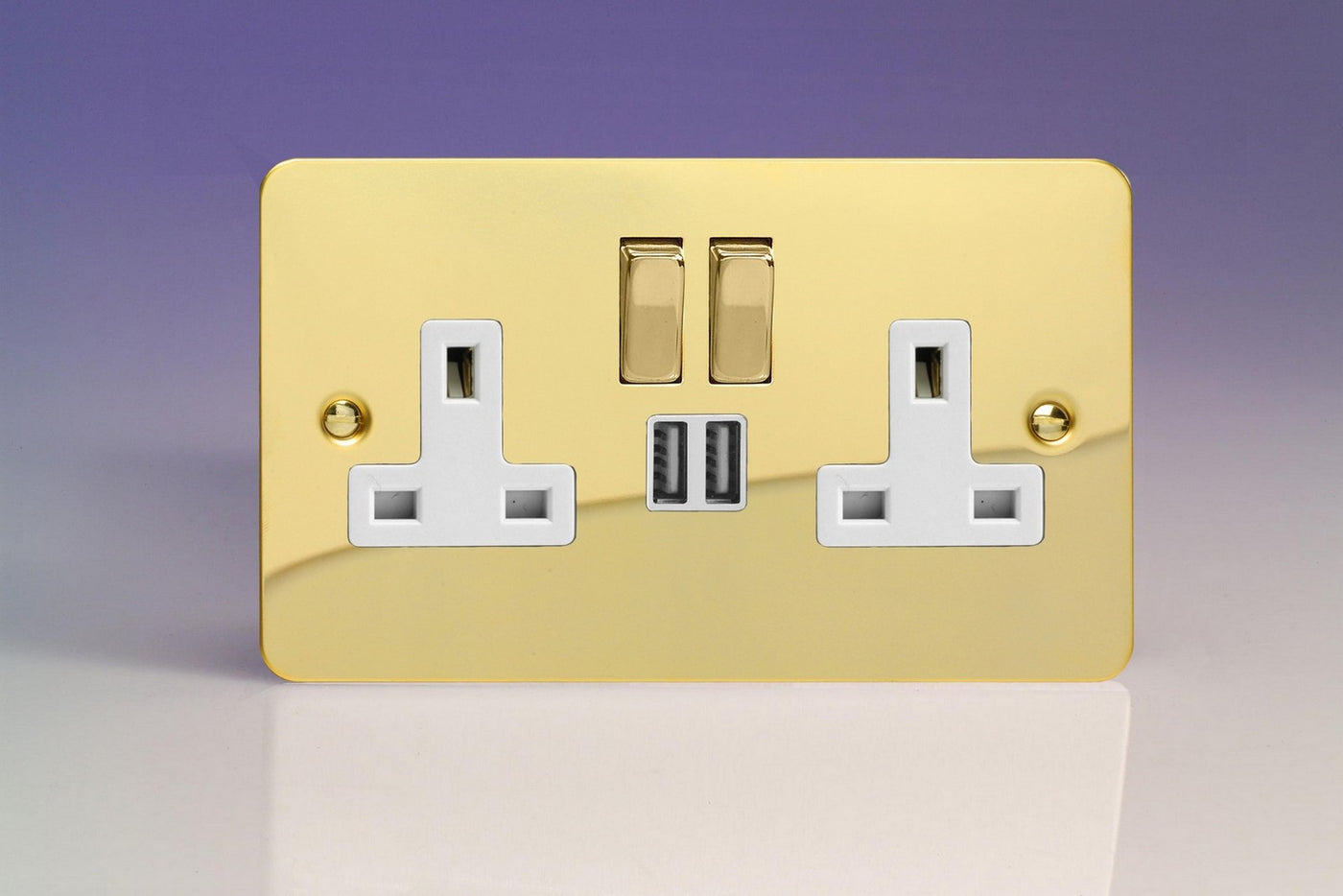 Varilight XFV5U2SDW - 2-Gang 13A Single Pole Switched Socket with Metal Rockers + 2x5V DC 2100mA USB Charging Ports